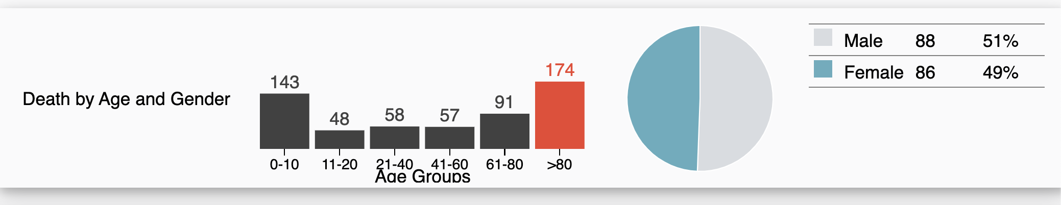 - I also found it interesting in the histogram and pie chart interaction that the idea that children and elderly are more susceptible to sickness related death, at least in this case, is true. There is a clear margin between the age ranges and the youngest and oldest groups had the highest death rates